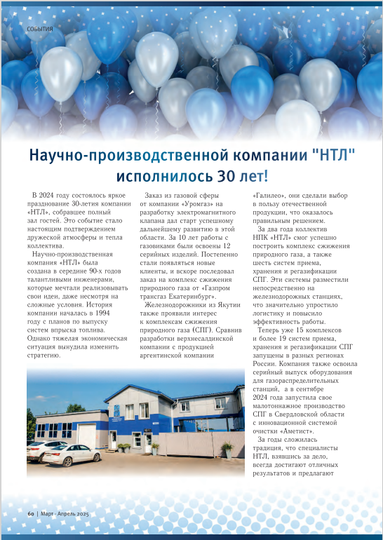 В мартовско-апрельском выпуске журнала "Мир газов" (№104 за 2025 год) опубликована статья о знаменательной дате – 30-летнем юбилее ООО НПК НТЛ, одного из ведущих игроков на рынке газового оборудования и технологий в России.