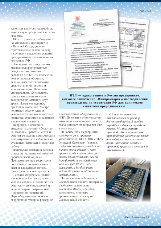 В мартовско-апрельском выпуске журнала "Мир газов" (№104 за 2025 год) опубликована статья о знаменательной дате – 30-летнем юбилее ООО НПК НТЛ, одного из ведущих игроков на рынке газового оборудования и технологий в России.